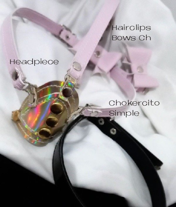 El Set Incluye: 1 Headpice Bicolor: Rosa/Dorado + 1 Chokercito Simple Negro + 2 Moñitos en Hebillas Rosa. En Sintético Charol con Herrajes Niquelados. Realizado a Pedido y a Medida (Requiere 3 medidas: VER ESQUEMA). Tiempo de Producción durante el mes de Octubre 7 días Hábiles. Resto del año 20 días Hábiles. (NO Incluye el Tiempo de Envío).
