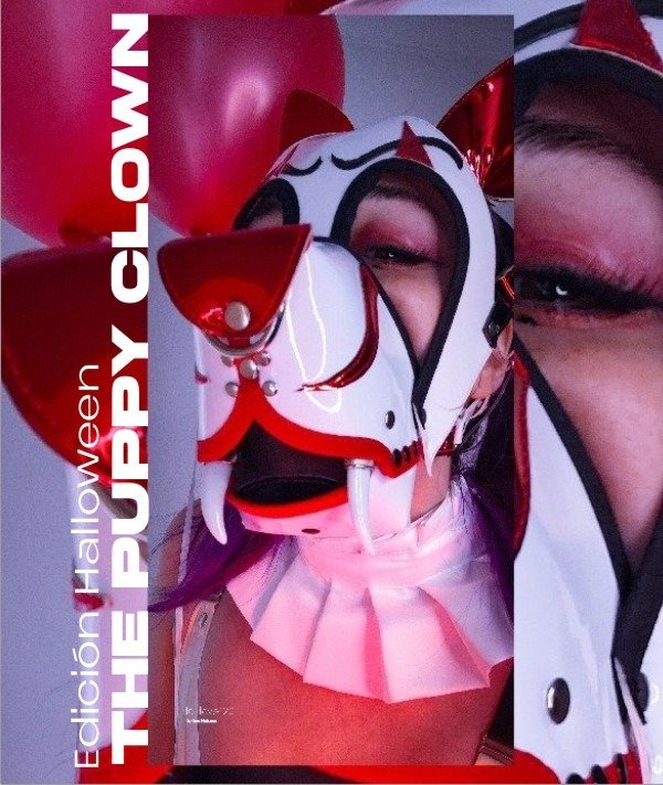 The Puppy Clown Mask -Edición Halloween- en Sintético Charol y Sintético Espejo con Colmillos y Herrajes Niquelados. Realizado a Pedido, Talle Único. Tiempo de Producción durante el mes de Octubre 7 días Hábiles. Resto del año 20 días Hábiles. (NO Incluye el Tiempo de Envío).